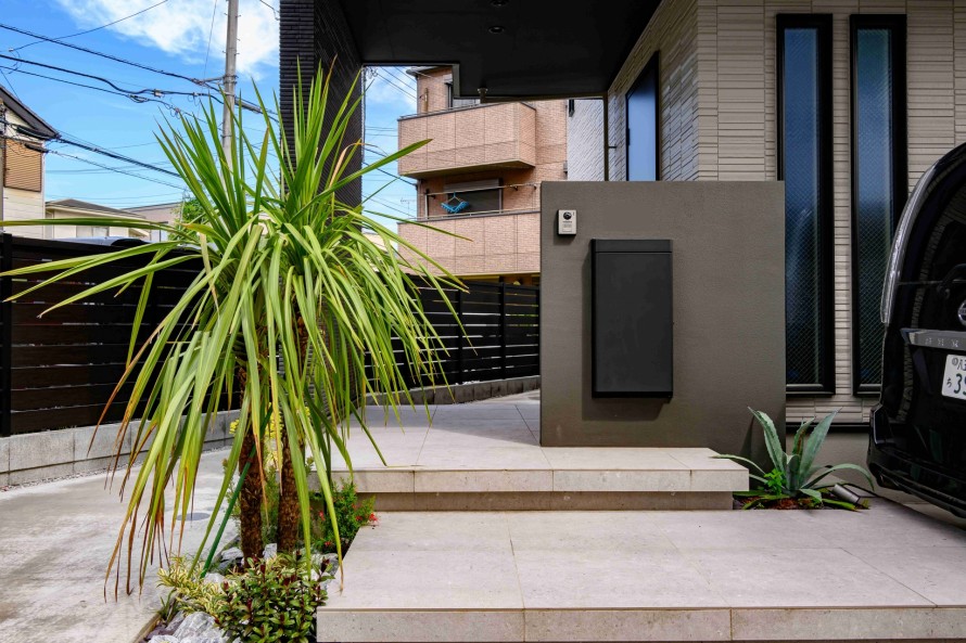 コンパクトデザインのアプローチにヤシの木でアクセントを加え、スタイリッシュに仕上げました。
